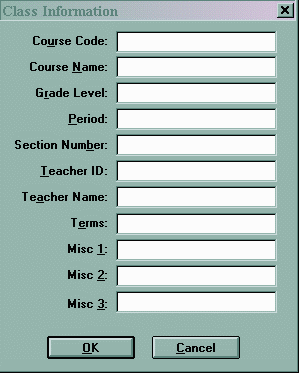 | Terms | This field should contain the terms during which your class is taught. For example, if your class is taught during first term, you should enter a 1 in this field. If your class is taught during terms 1 and 2, you should enter 12 for this field. This is not a required field. |